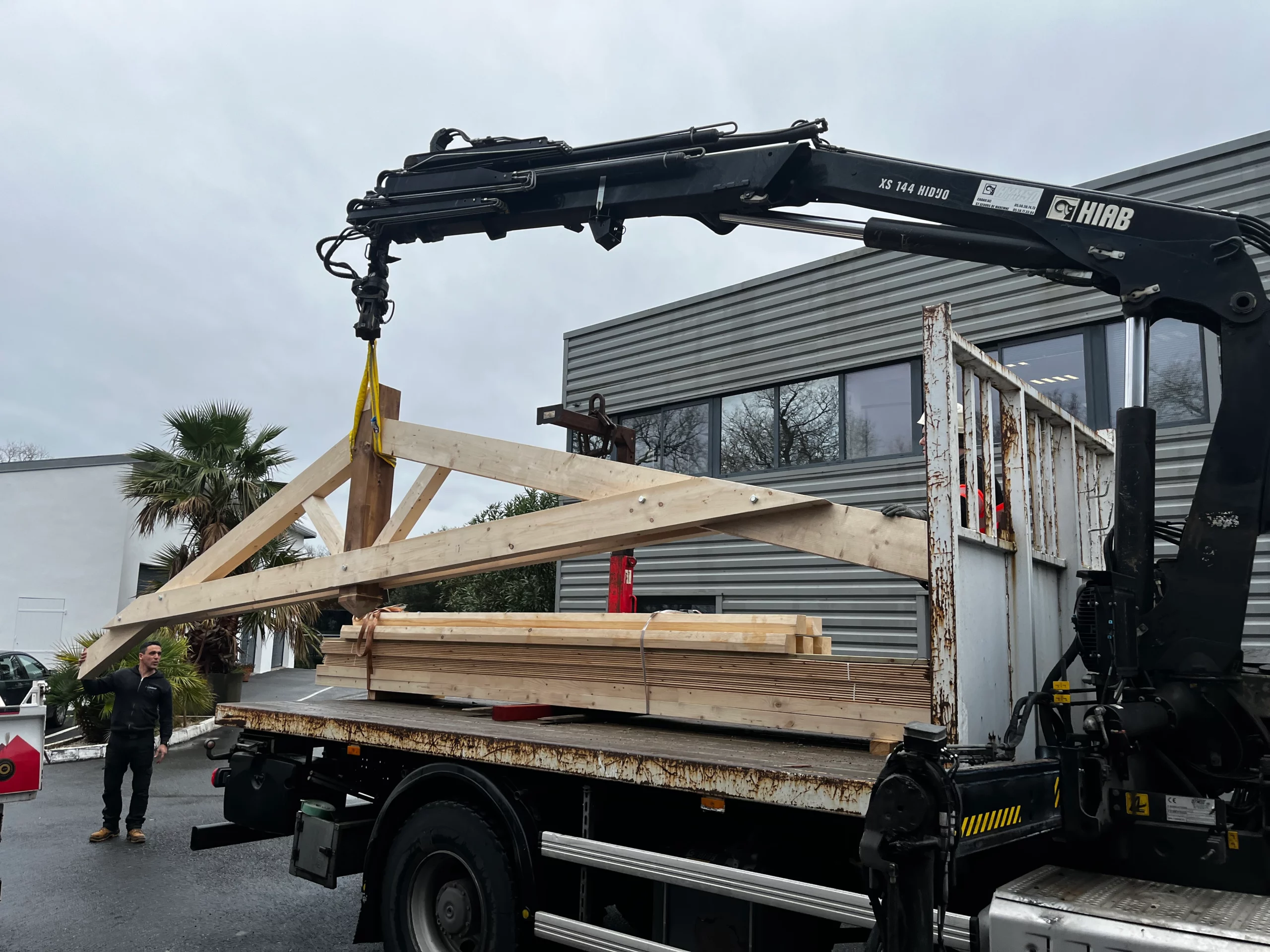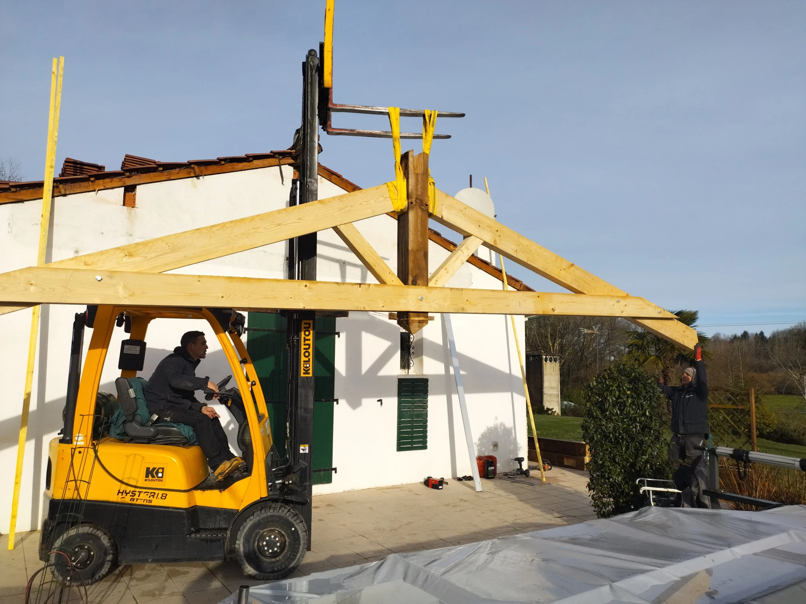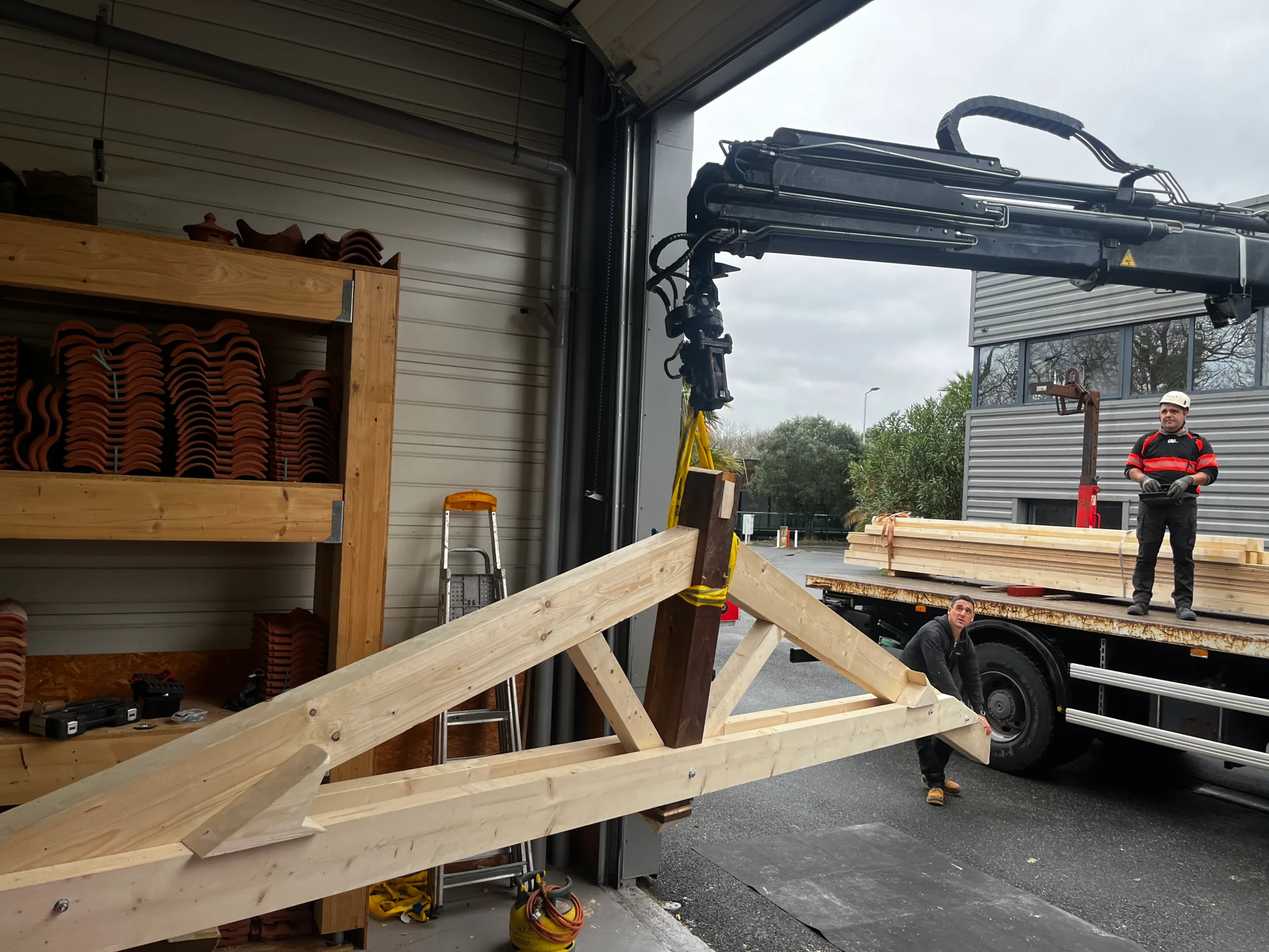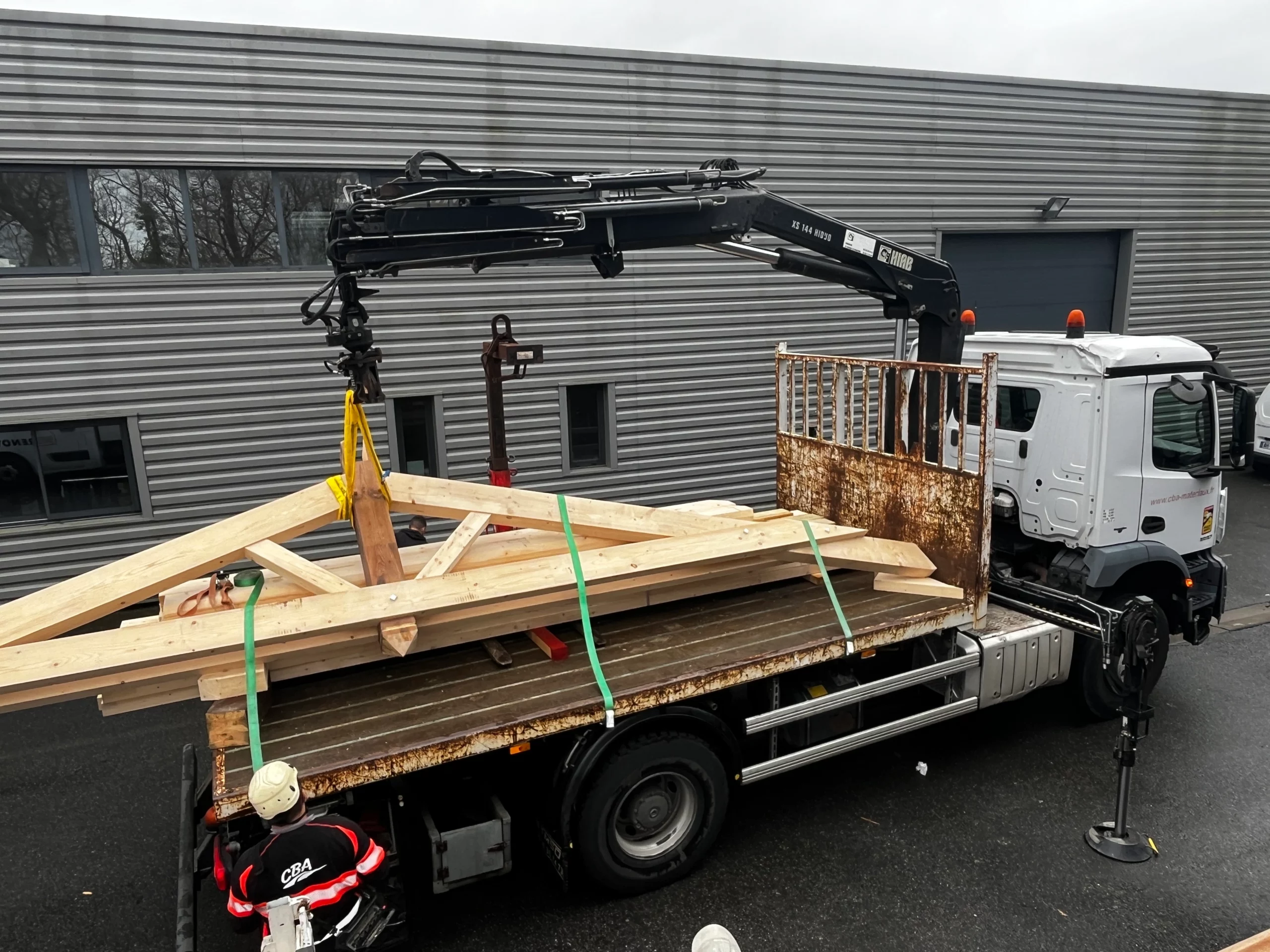 Une fois la charpente préparée et affrétée, l’installation a été réalisée directement sur site. Les points d’ancrage ont été vérifiés pour offrir une assise fiable à la nouvelle structure. Le levage et le positionnement de la ferme ont ensuite été effectués avec attention afin de respecter les alignements et la géométrie globale de la toiture.
