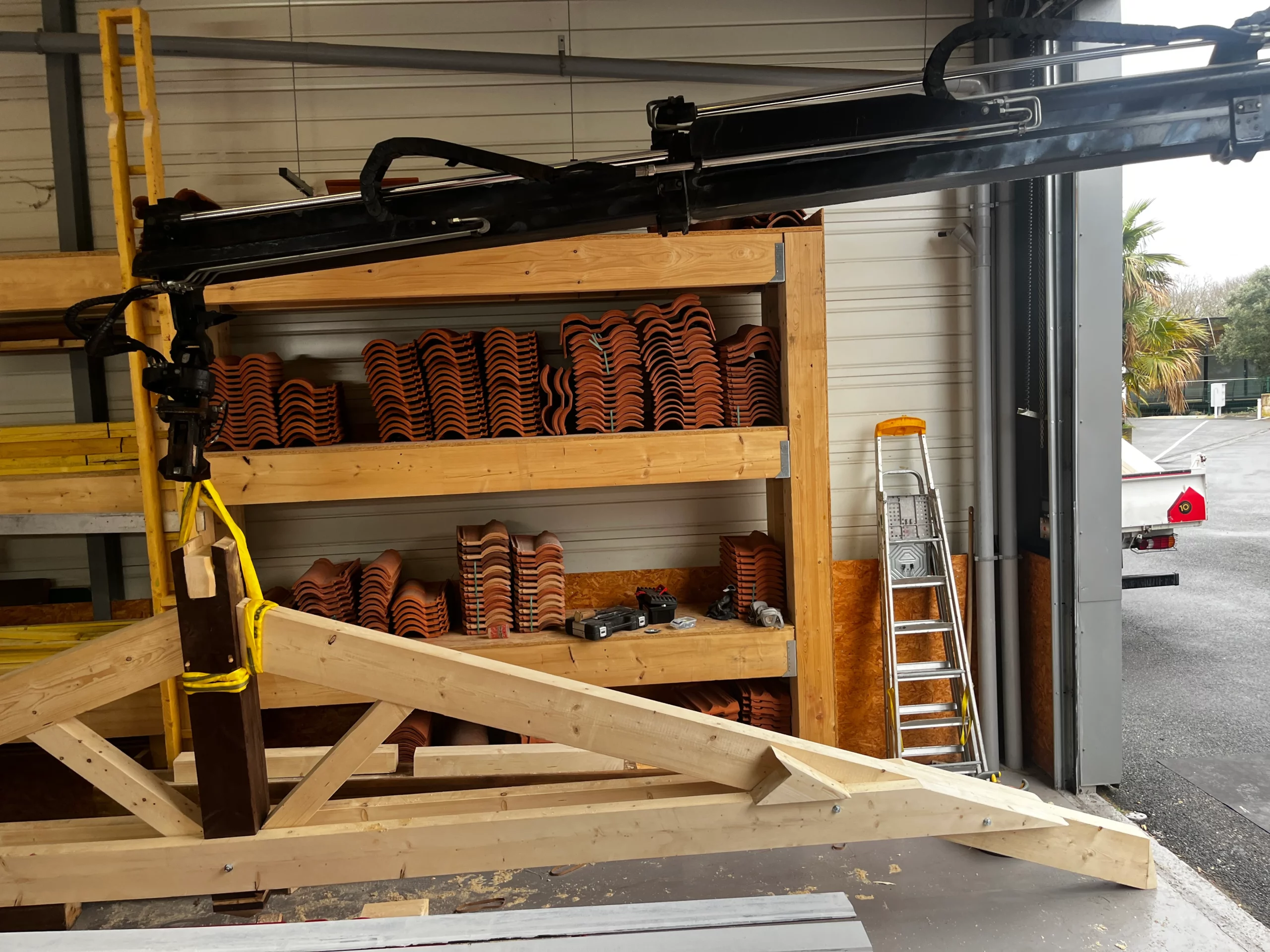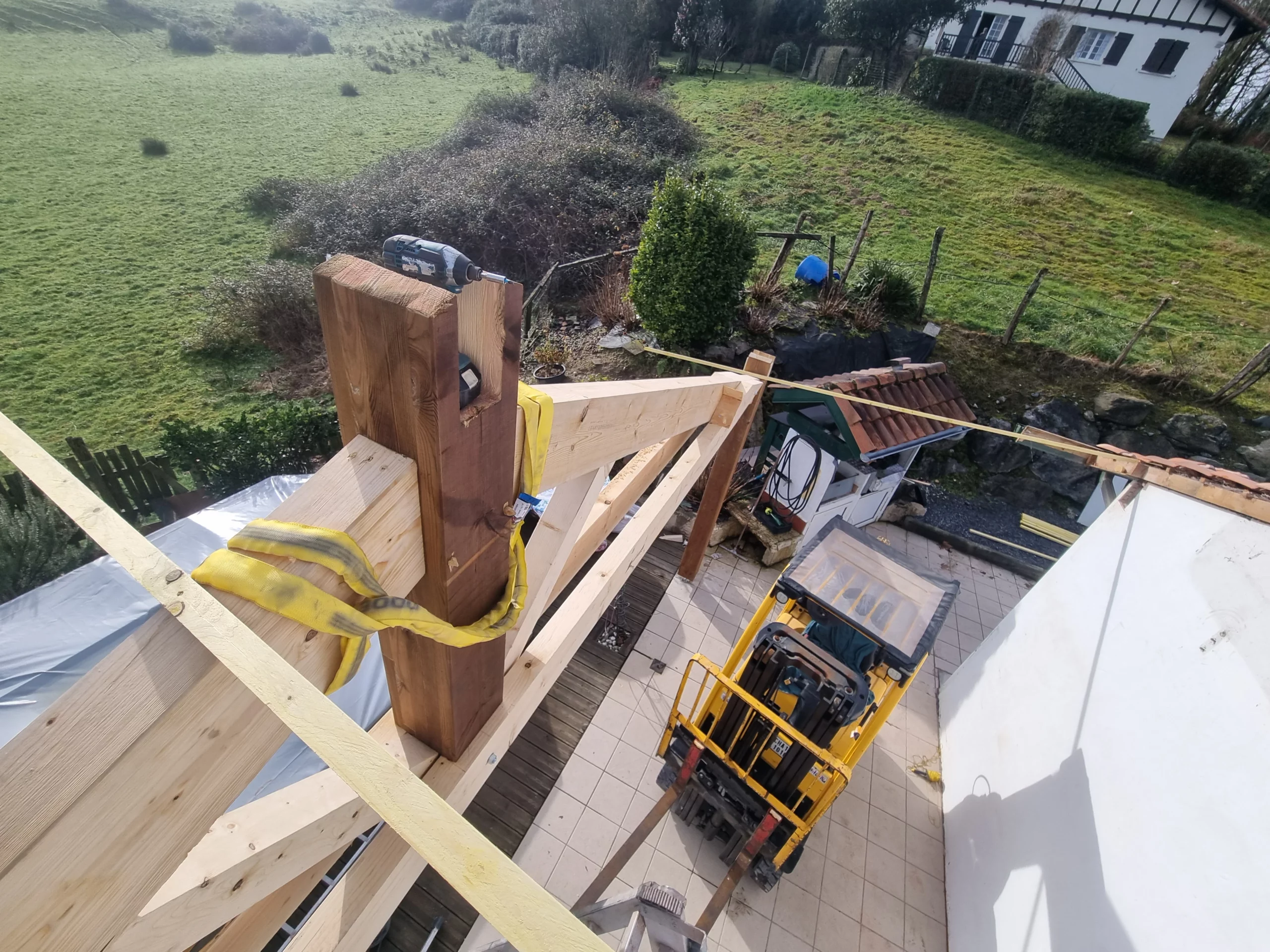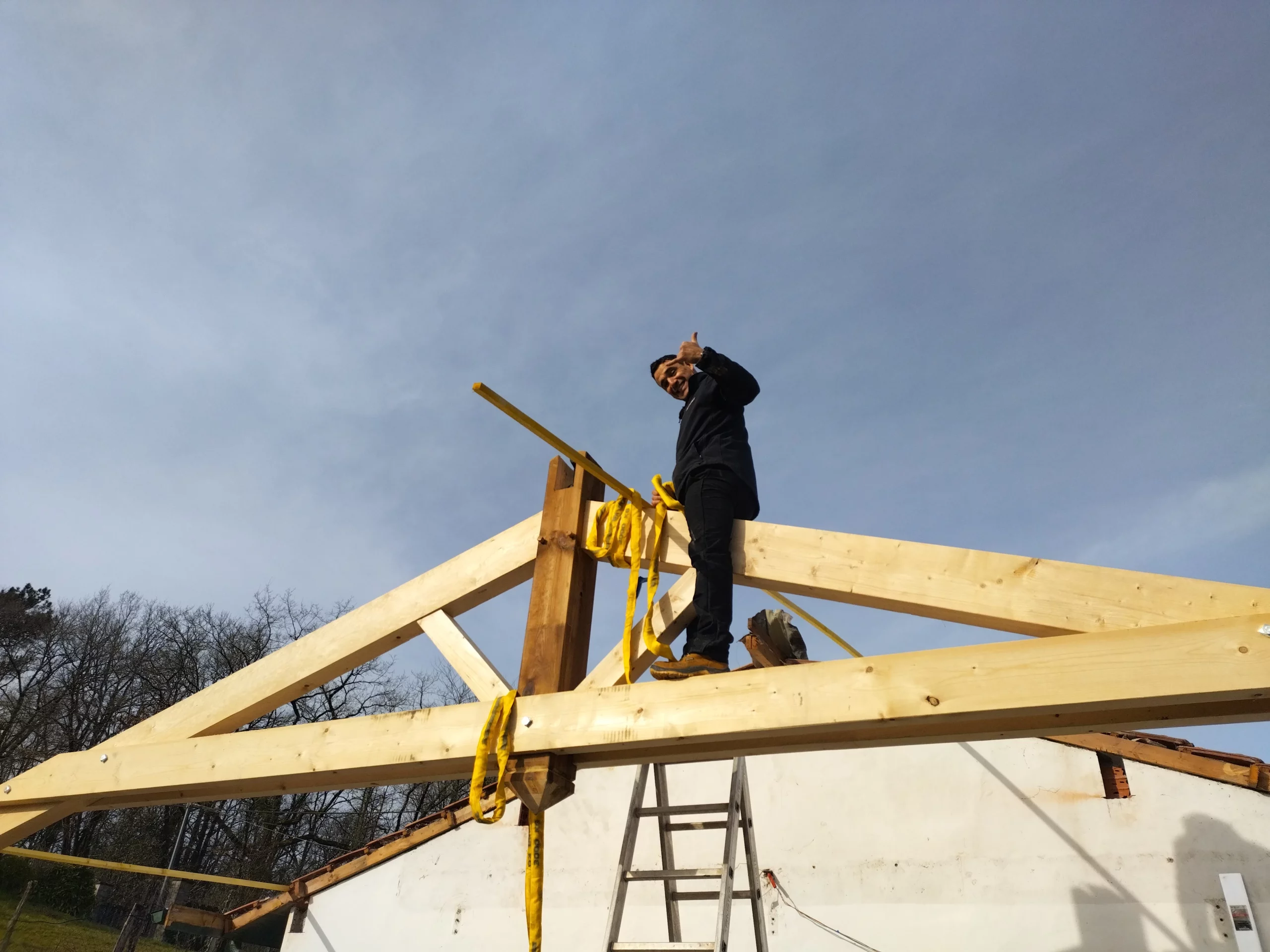 Une fois la charpente préparée et affrétée, l’installation a été réalisée directement sur site. Les points d’ancrage ont été vérifiés pour offrir une assise fiable à la nouvelle structure. Le levage et le positionnement de la ferme ont ensuite été effectués avec attention afin de respecter les alignements et la géométrie globale de la toiture.
