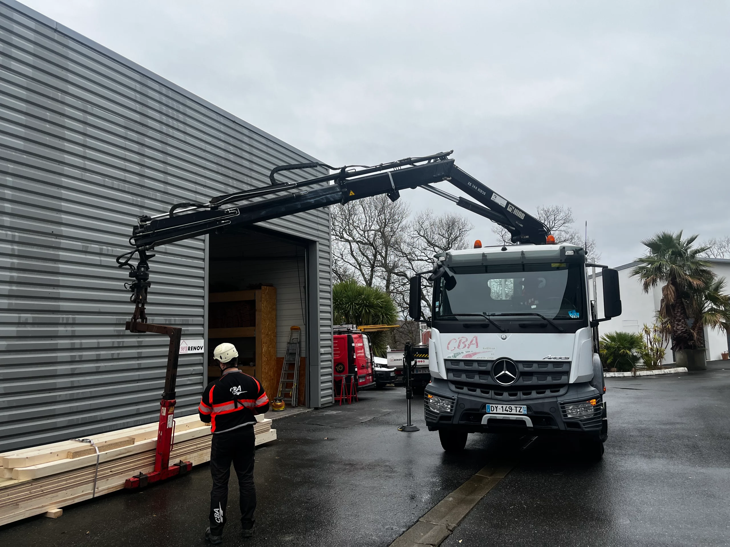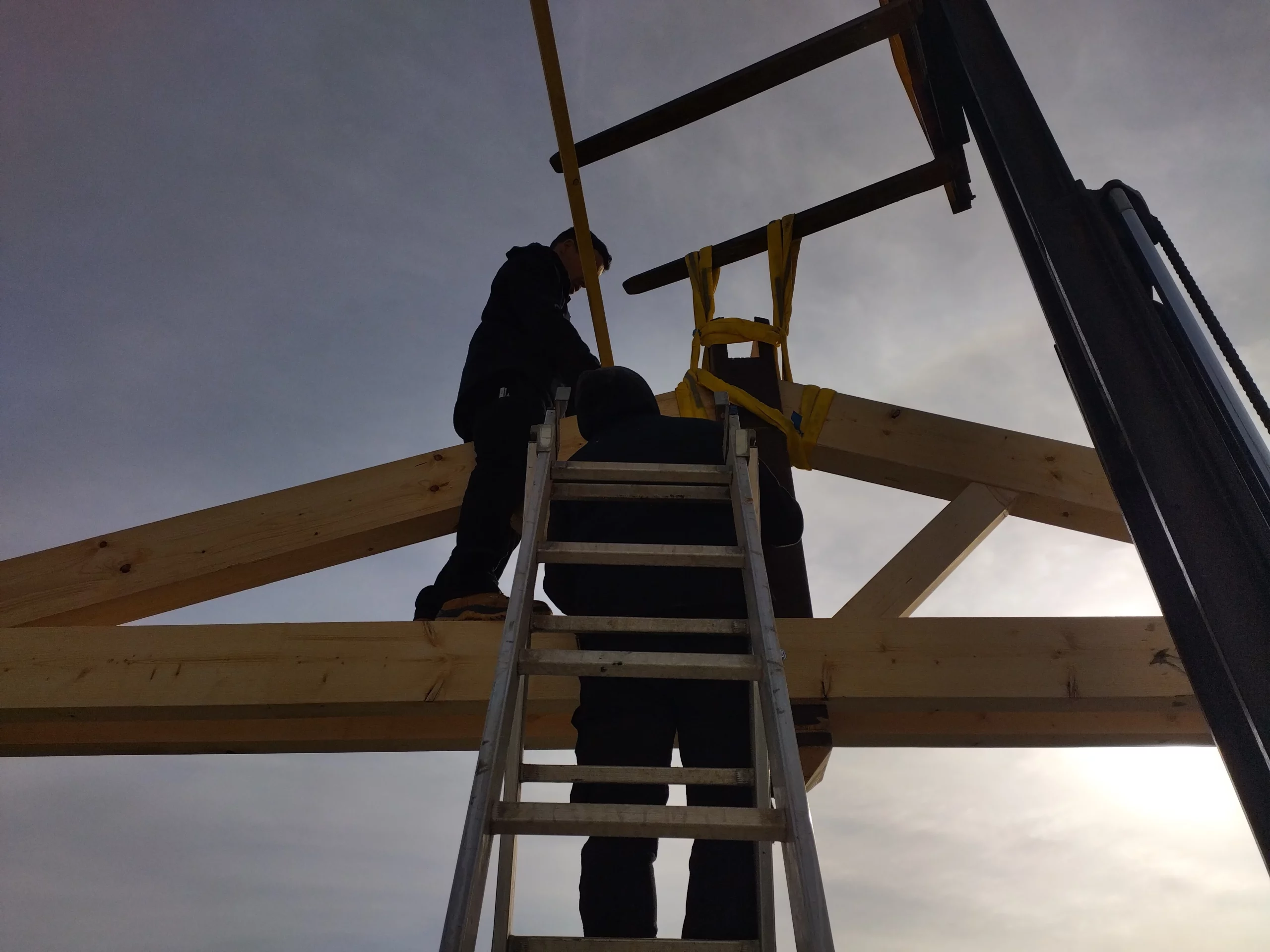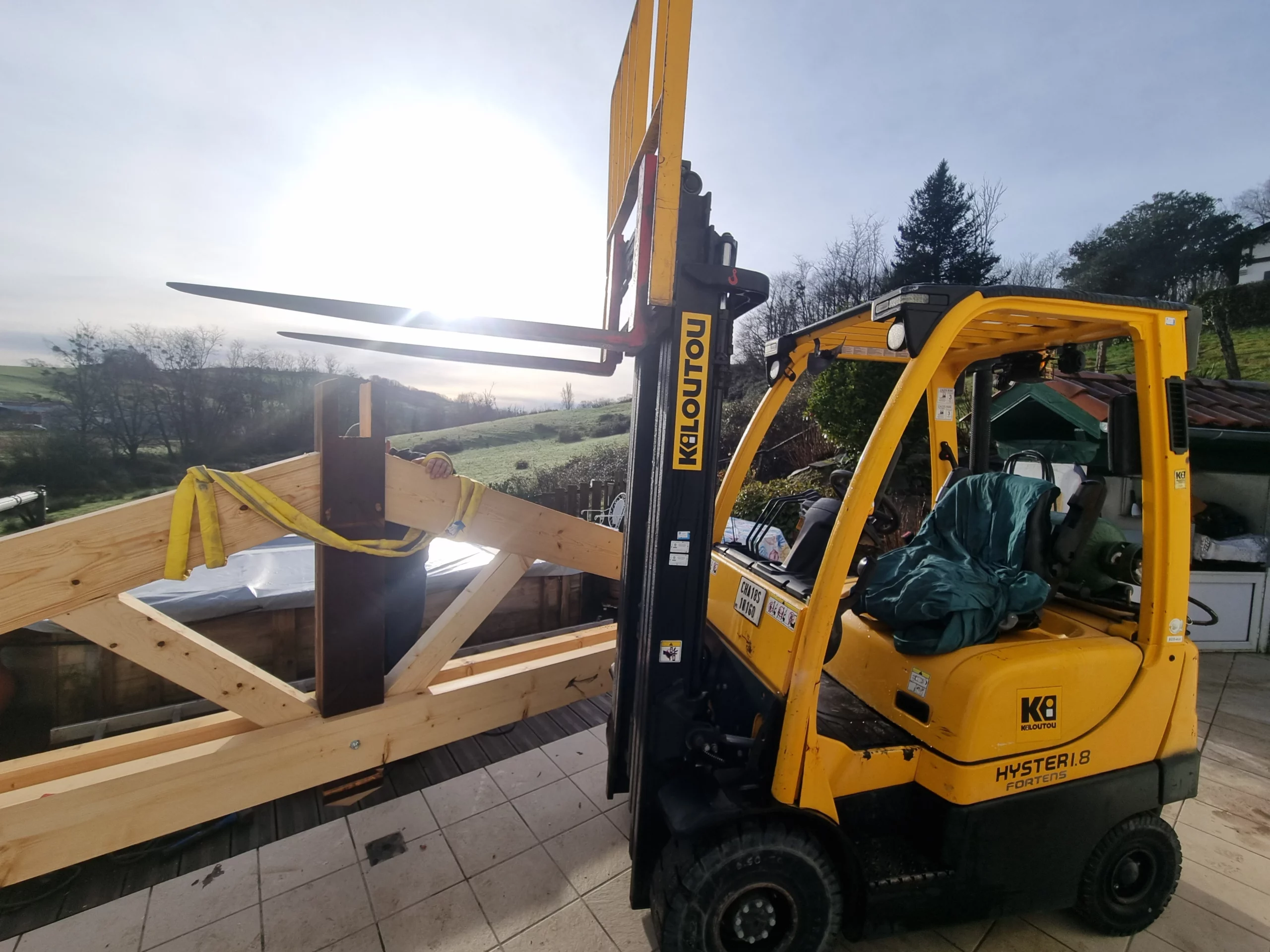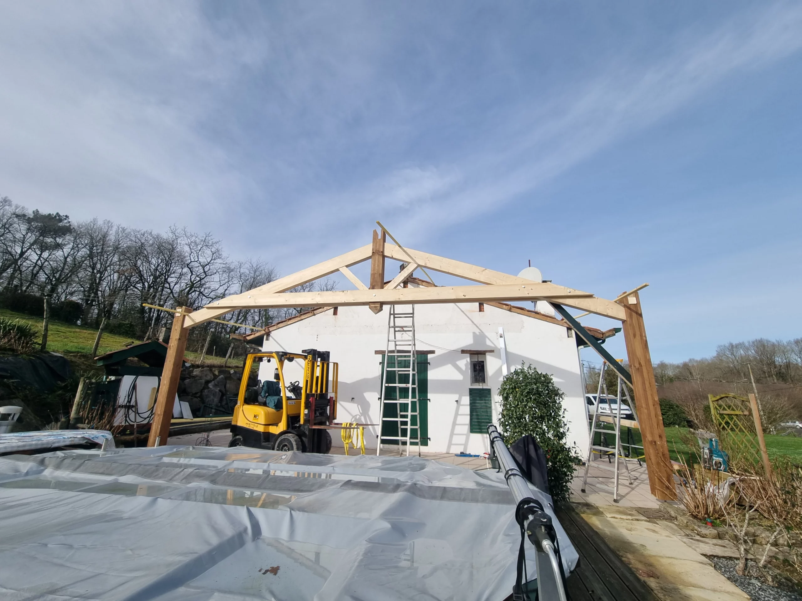 Une fois la charpente préparée et affrétée, l’installation a été réalisée directement sur site. Les points d’ancrage ont été vérifiés pour offrir une assise fiable à la nouvelle structure. Le levage et le positionnement de la ferme ont ensuite été effectués avec attention afin de respecter les alignements et la géométrie globale de la toiture.