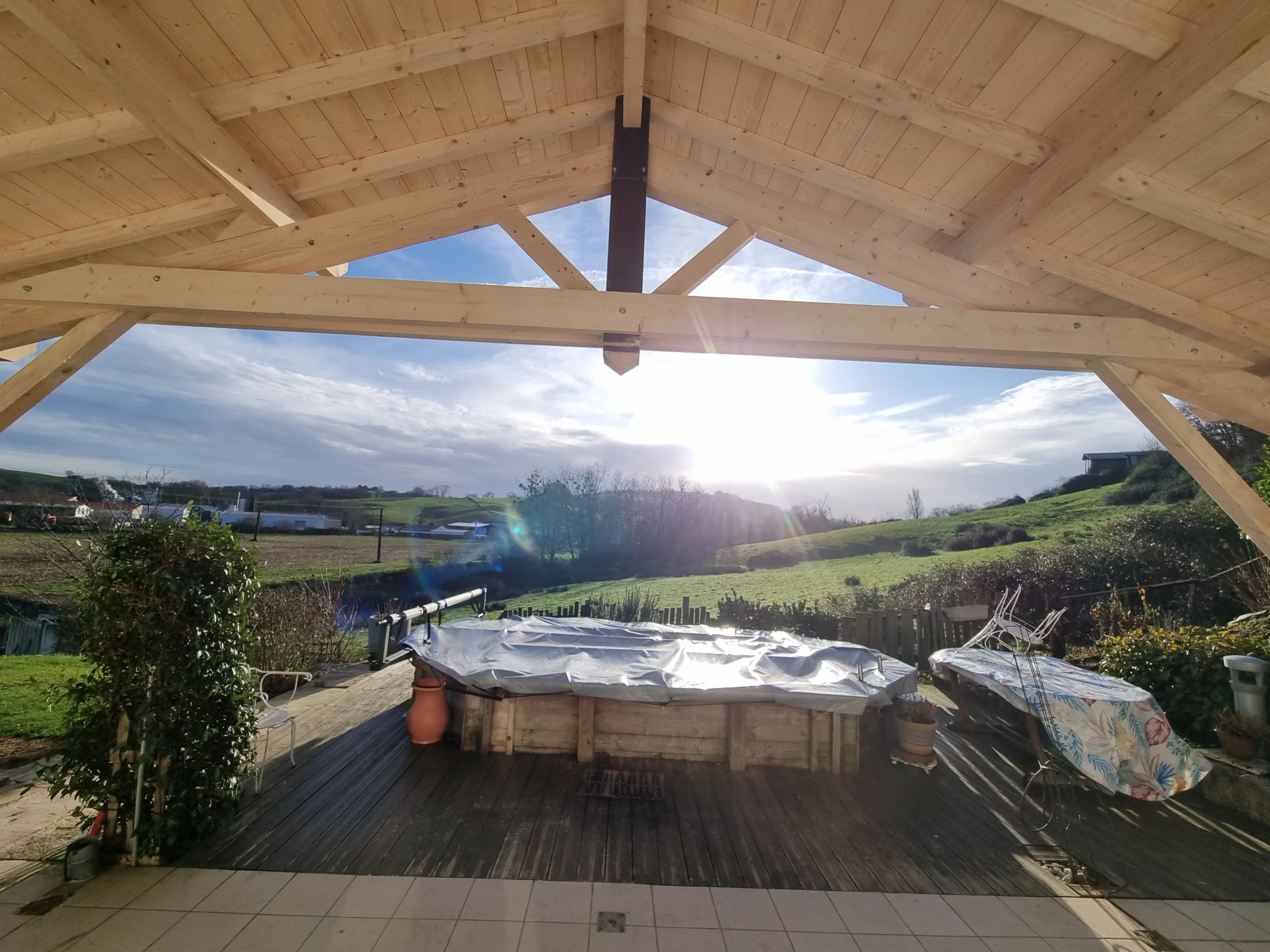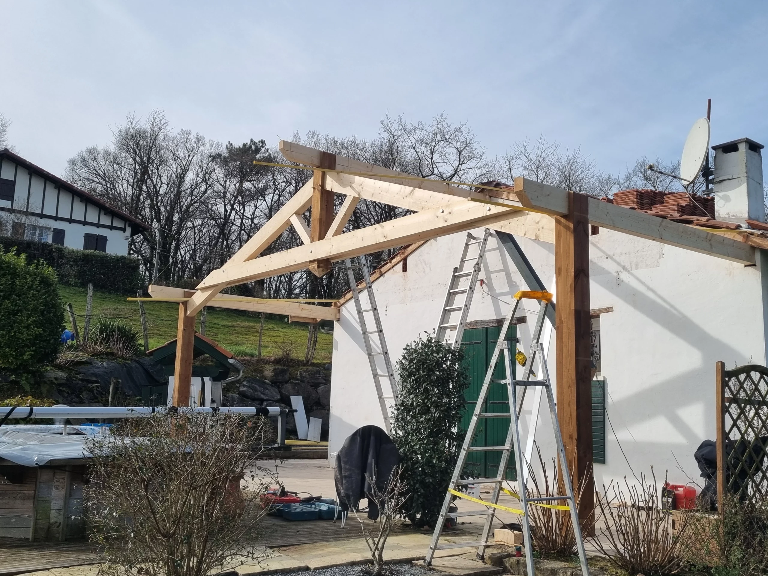 La structure est soutenue par deux poteaux sur blochets permettant de sécuriser l’ensemble tout en conservant une lecture esthétique propre aux charpentes traditionnelles. Chaque pièce de bois a été dimensionnée avec précision afin d’assurer stabilité et durabilité.