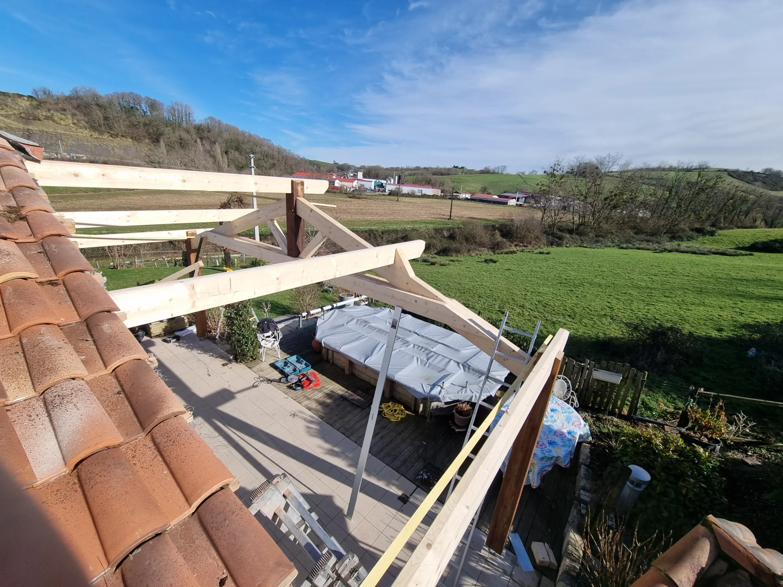 L’objectif était clair : prolonger la toiture pour couvrir la future terrasse sans créer de rupture visuelle avec la maison.