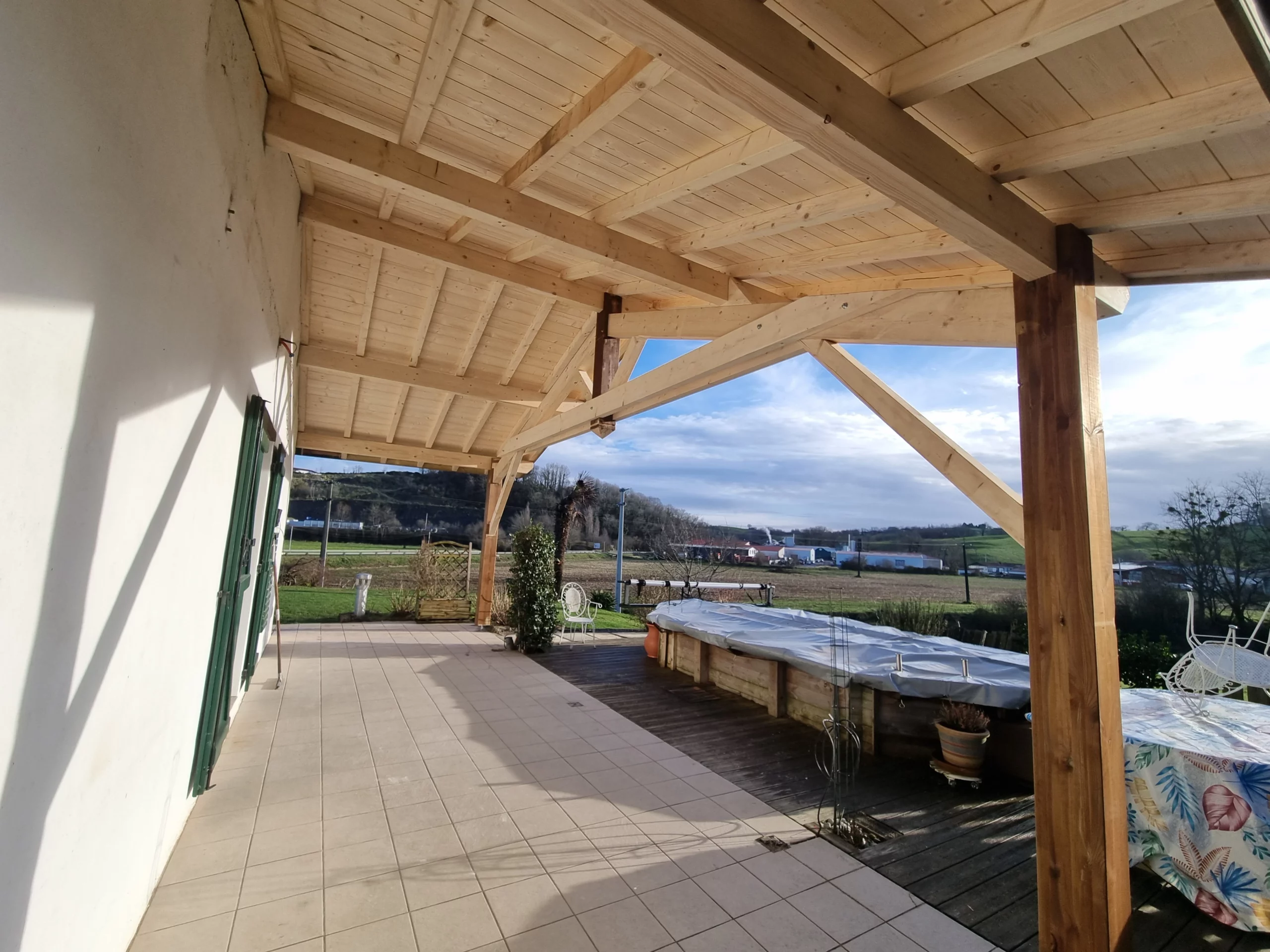 L’ajout des poteaux porteur participe à la reprise des charges tout en structurant l’espace de la terrasse couverte. Cette configuration permet de dégager un volume confortable sous toiture, idéal pour un usage quotidien.