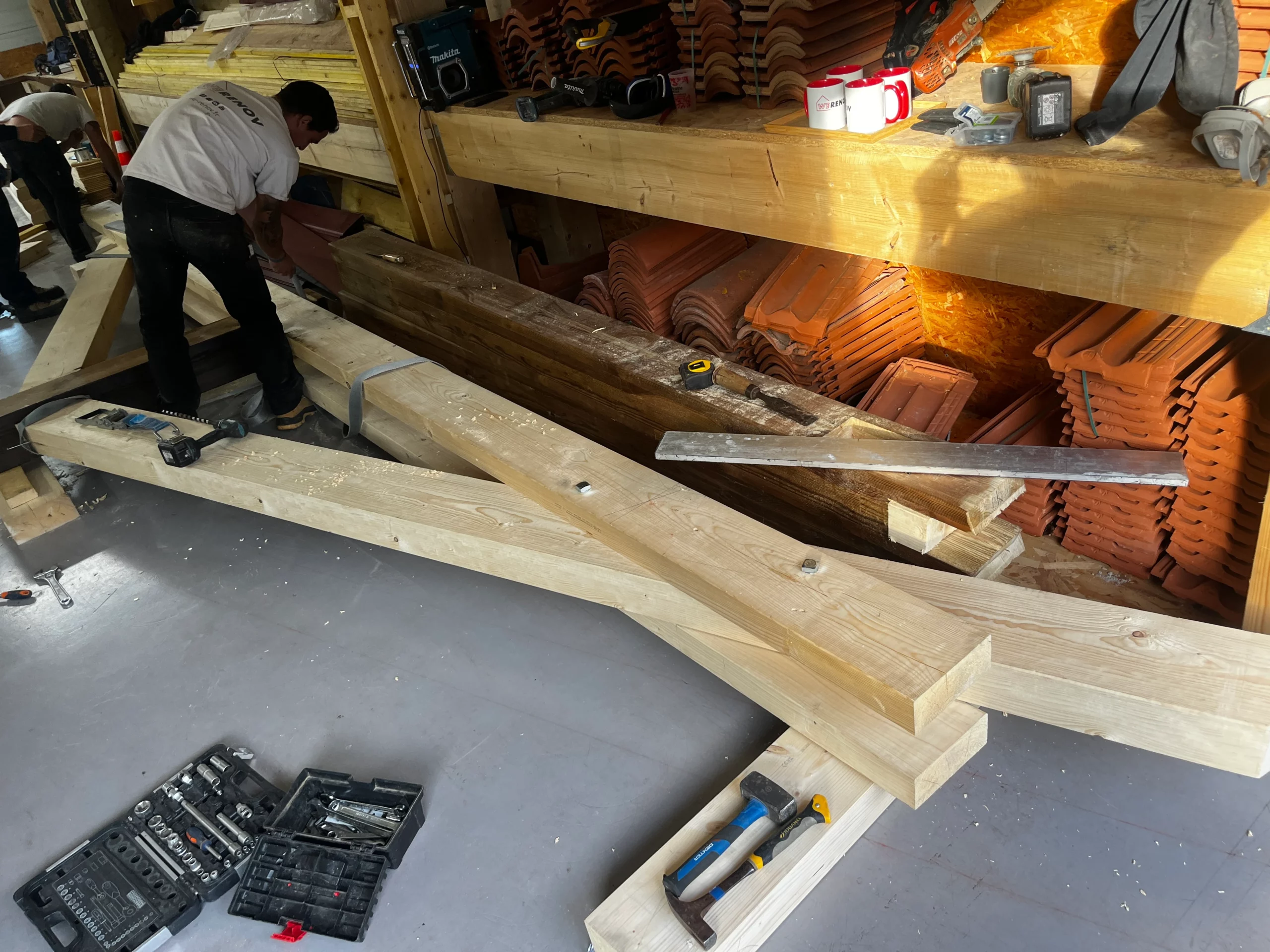 Avant de poursuivre avec la couverture, l’ensemble de la charpente a été contrôlé pour s’assurer de sa parfaite stabilité.