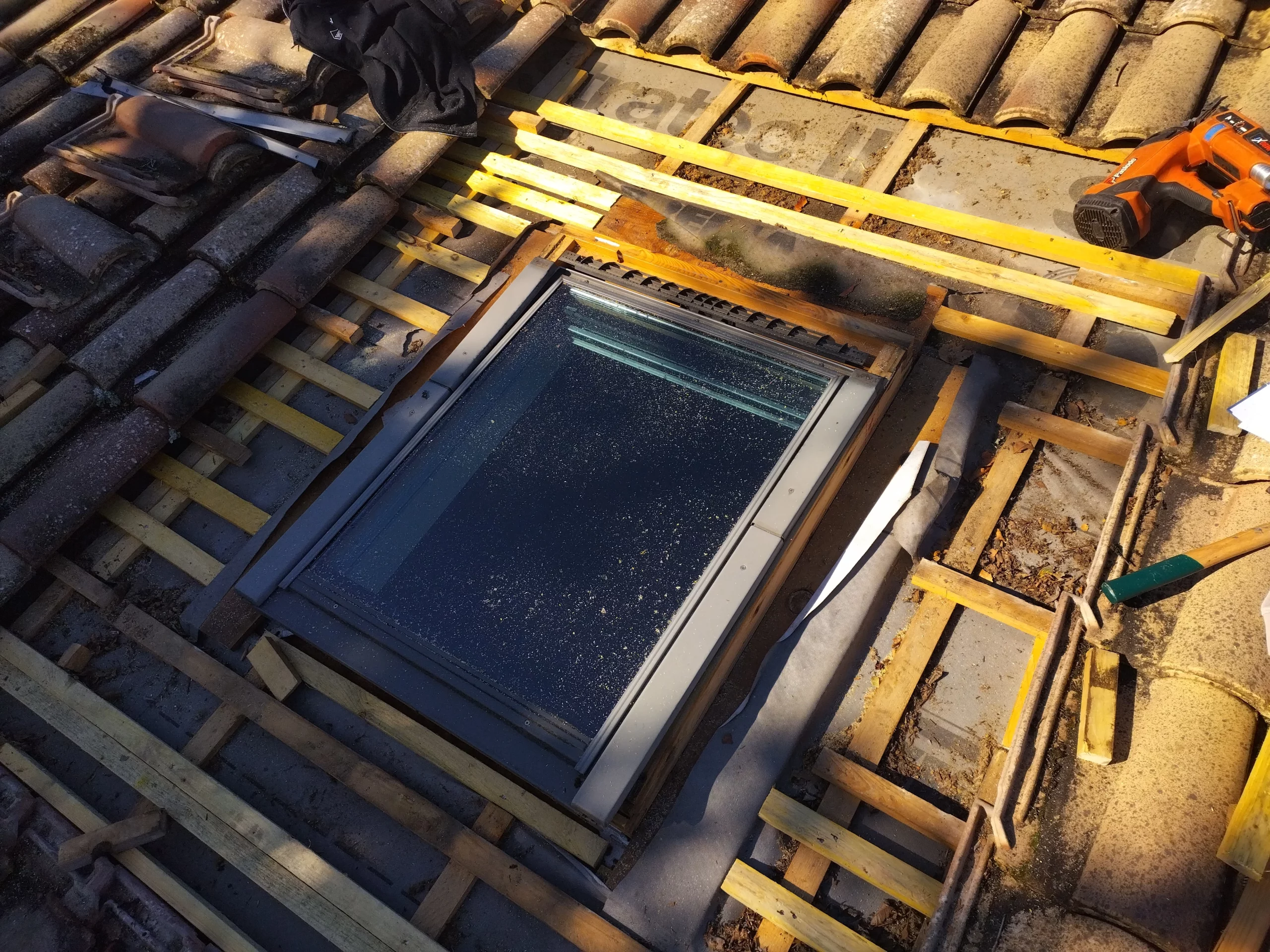 1. Dépose des anciens raccords : Nous avons soigneusement retiré les éléments d’étanchéité défectueux et les tuiles périphériques pour mettre à nu la zone de jonction entre le châssis du VELUX et la toiture.