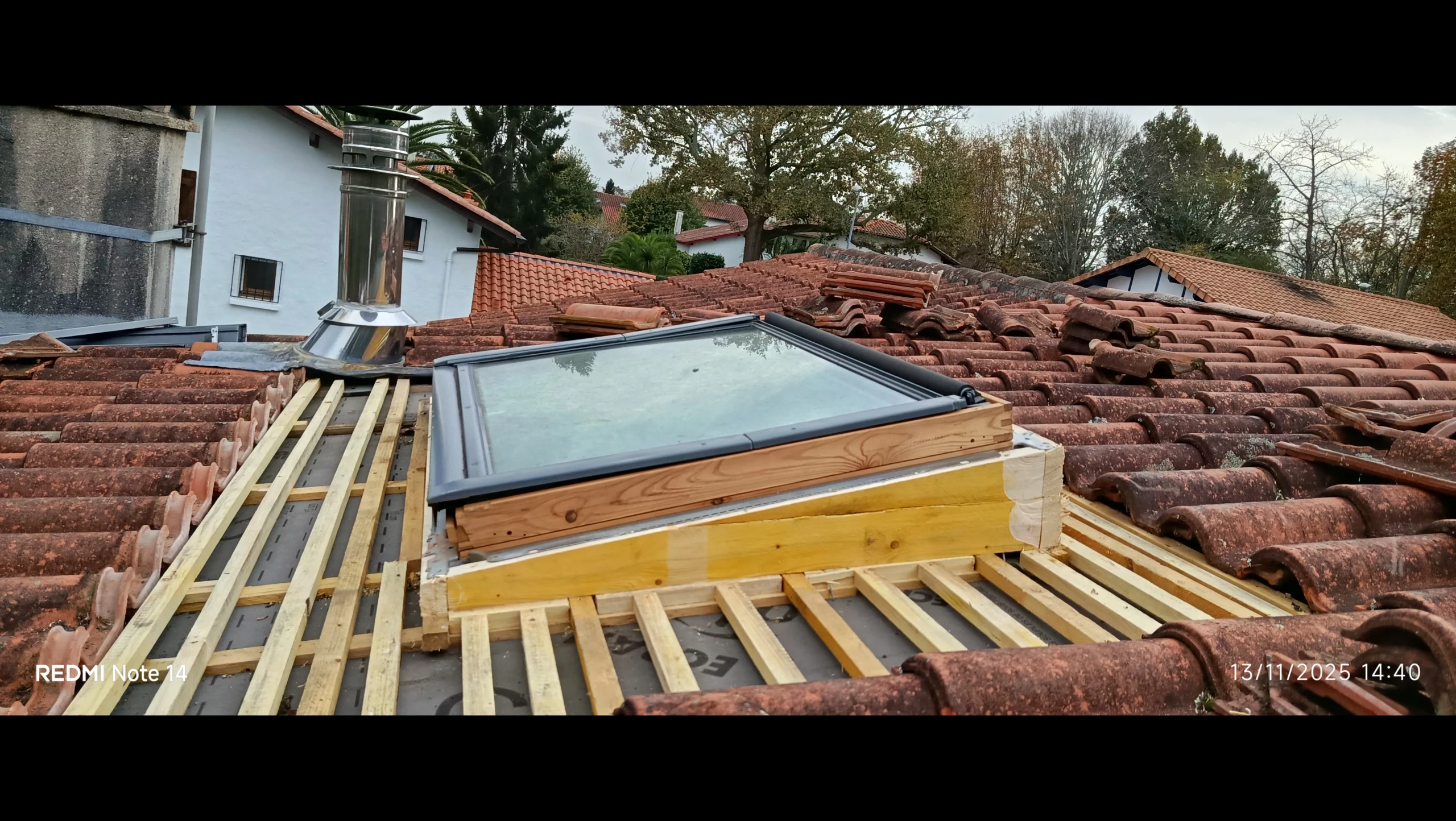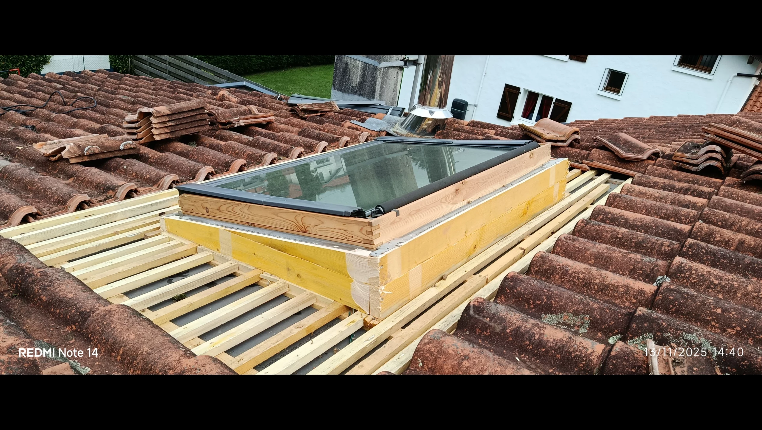 • Dépose complète du VELUX : Nous avons retiré la fenêtre de toit existante ainsi que les tuiles environnantes pour mettre la charpente à nu.