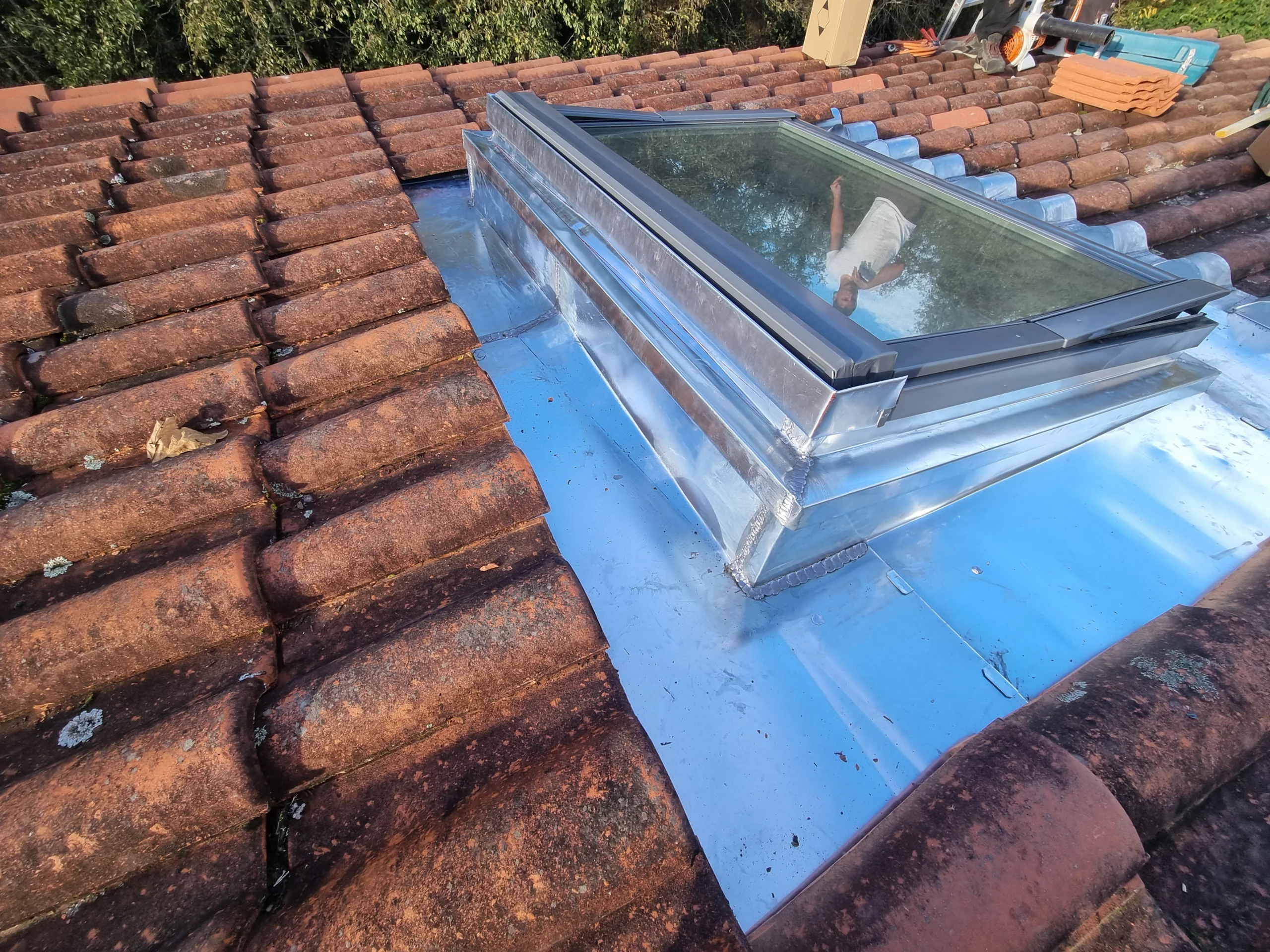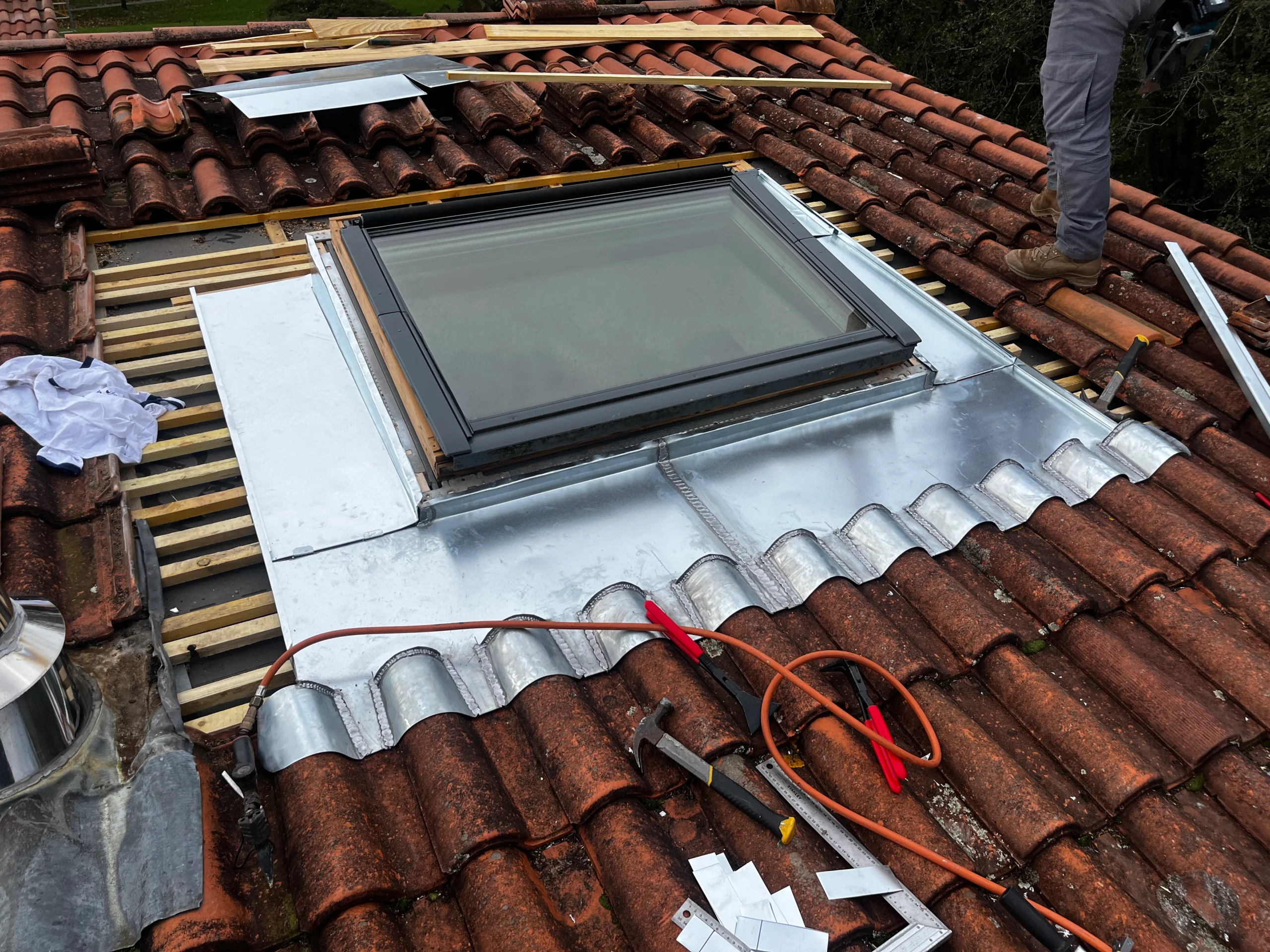 • Abergement intégral en zinc sur-mesure : Une fois la pente rectifiée, nos zingueurs ont réalisé un abergement complet. Ce « vêtement » de métal façonne l’étanchéité entre le toit, la nouvelle costière et le VELUX.