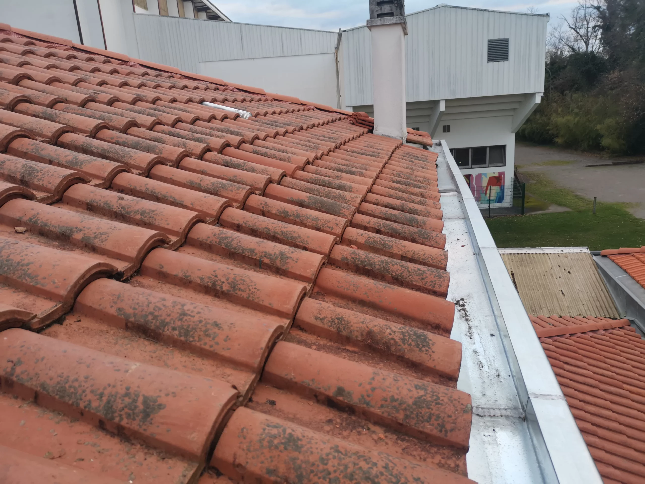 Sur une toiture, le chéneau joue un rôle essentiel dans la gestion des eaux pluviales. Contrairement à une gouttière classique, il est directement intégré à la structure et permet de recueillir et d’acheminer de grands volumes d’eau vers les descentes. À Biarritz, nous avons récemment réalisé un chantier de remplacement de chéneaux sur toute la périphérie d’une toiture, suite à des problèmes d’étanchéité devenus récurrents.