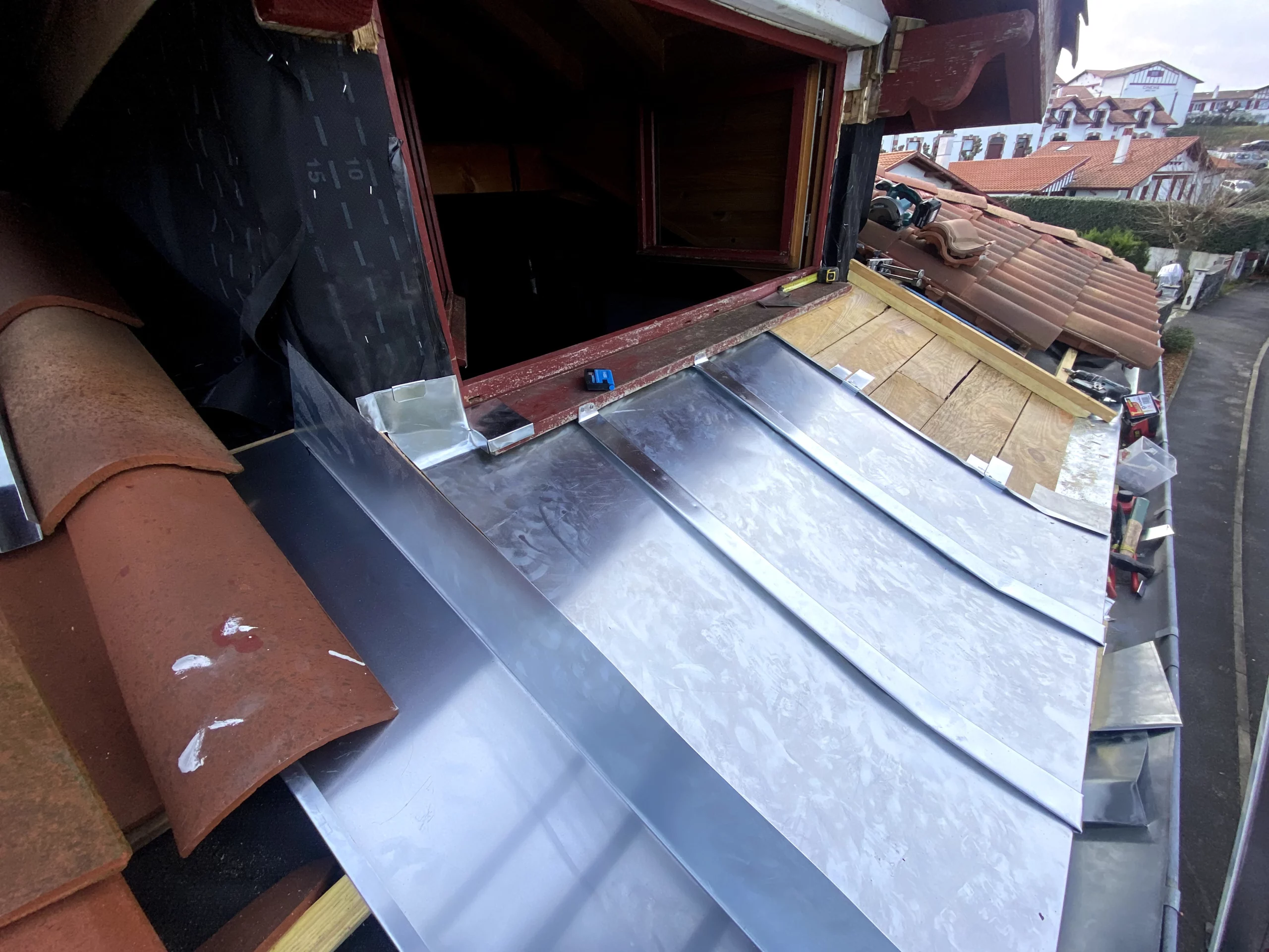 Le remplacement de cet abergement en zinc à Guéthary a permis de résoudre durablement les problèmes d’étanchéité rencontrés sur cette toiture. Grâce à une fabrication sur-mesure puis à une pose précise et maîtrisée, l’abergement assure désormais une protection fiable contre les infiltrations d’eau.